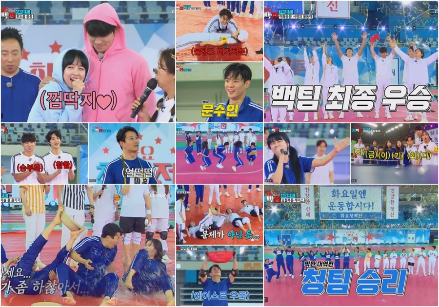 8대 선수단의 6라운드 게임은 서로의 후드티 끈을 잇고 상대팀의 옆통수에 있는 단어를 맞히면 승리하는… 마지막 라운드로 업혀있는 여자 선수가 물이 담긴 바가지를 남자 선수 머리 위에 얹고 출발점에 돌아와 물을 담는…