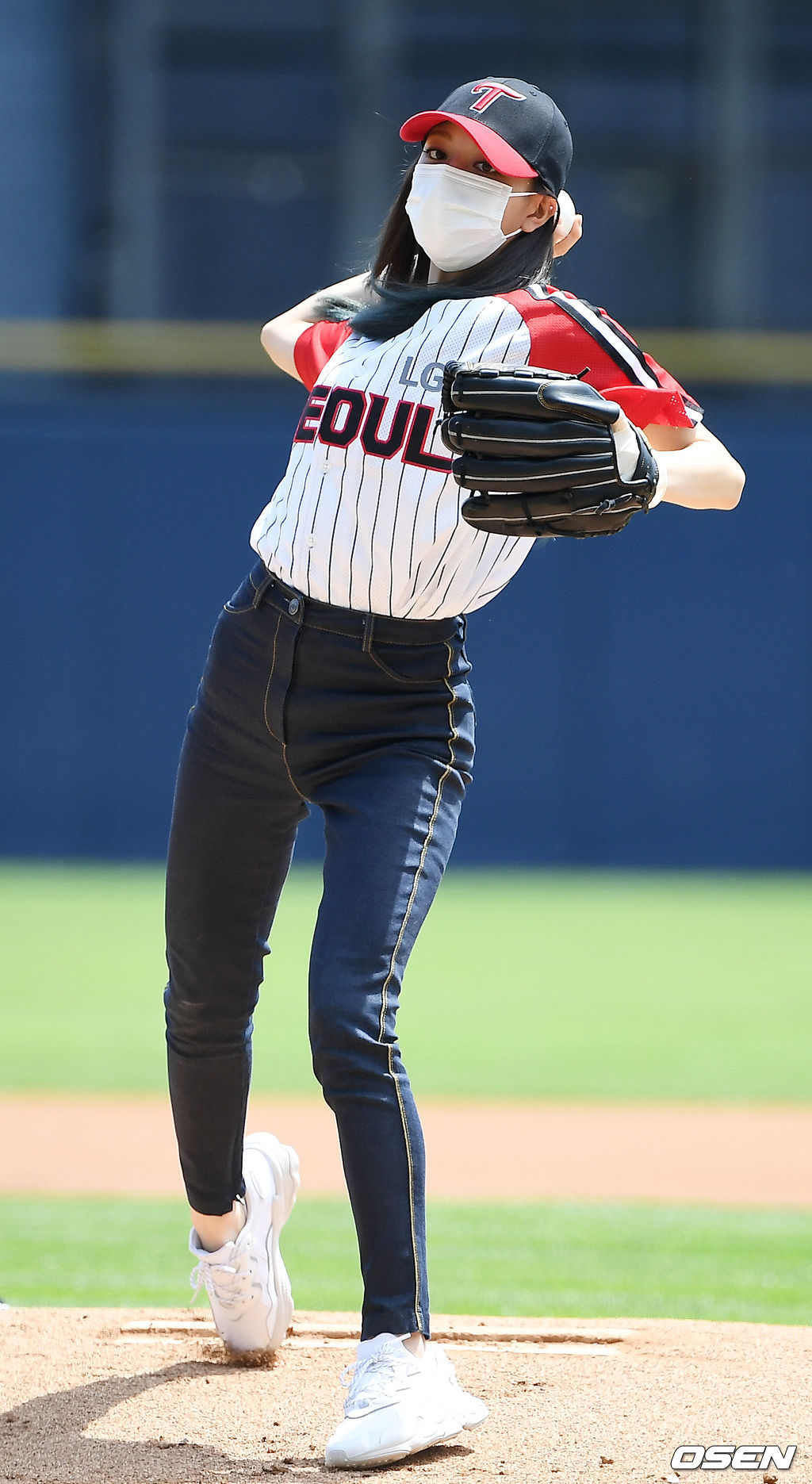 30일 오후 서울 잠실야구장에서 2021 신한은행 SOL KBO리그 LG 트윈스와 키움 히어로즈의 경기가 열렸다. 경기 전 걸그룹 있지 유나가 시구를 하고 있다. 2021.05.30