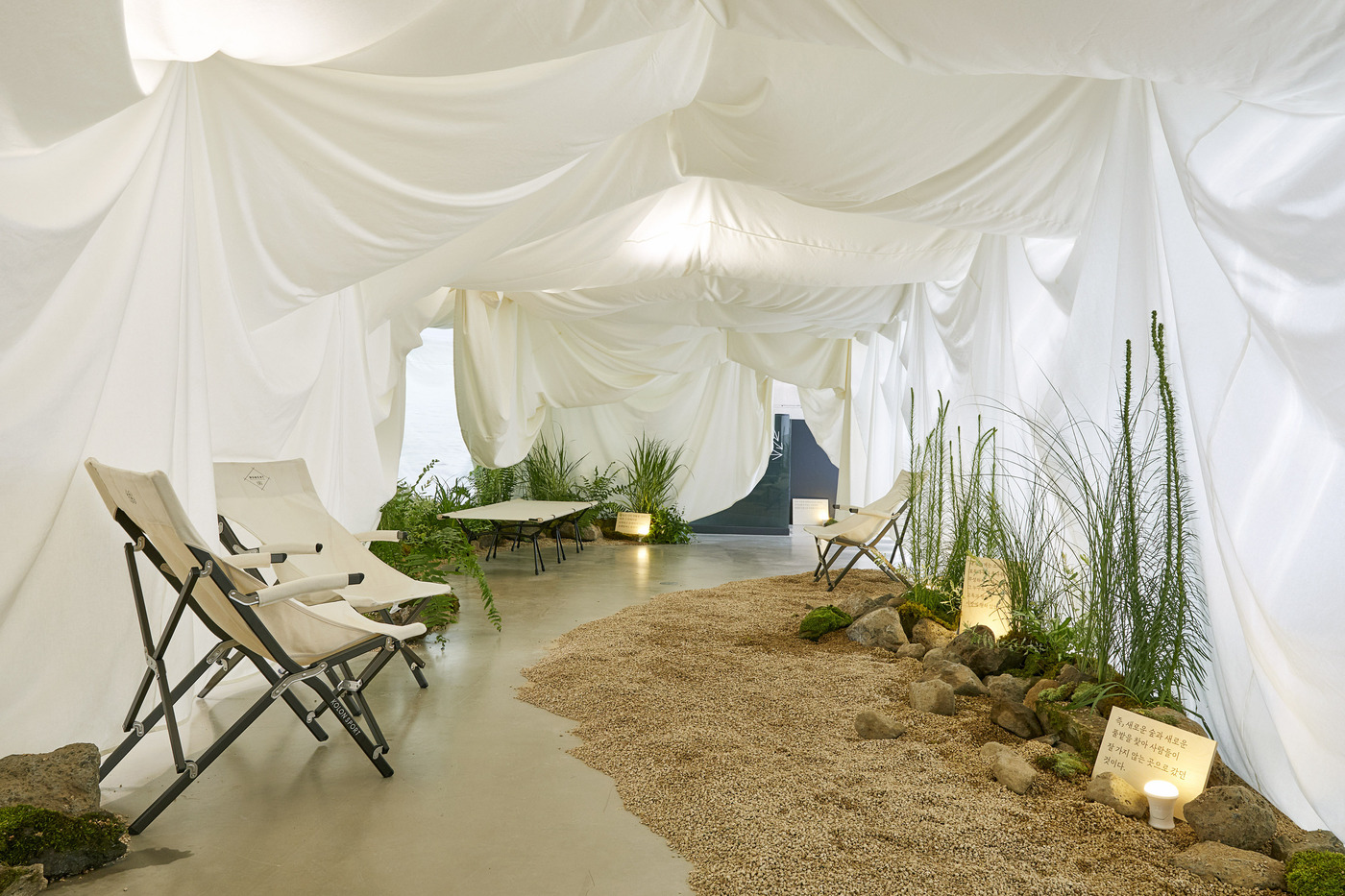 텐트, 타프, 해먹 등 캠핑에 있어서 가장 큰 구조물을 이루는 용품의 소재를 사용해 산의 지형을 표현하고 그 안에 휴식 공간을 배치해 캠핑을 떠난 것과 같은 느낌을 주도록 기획했다. 자연과 교감하며 사색의 시간을 즐기도록…