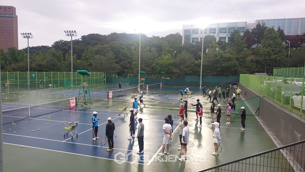 중급반, 상급반으로 나뉘어 열심히 설명을 듣고 있는 참가자들 (사진제공=강도영 기자)  5월 마지막 주말인 29일 중구테니스협회 주관으로 제 1회 중구테니스회원 및 중구민 대상 테니스 무료레슨행사가 중구체육회와…